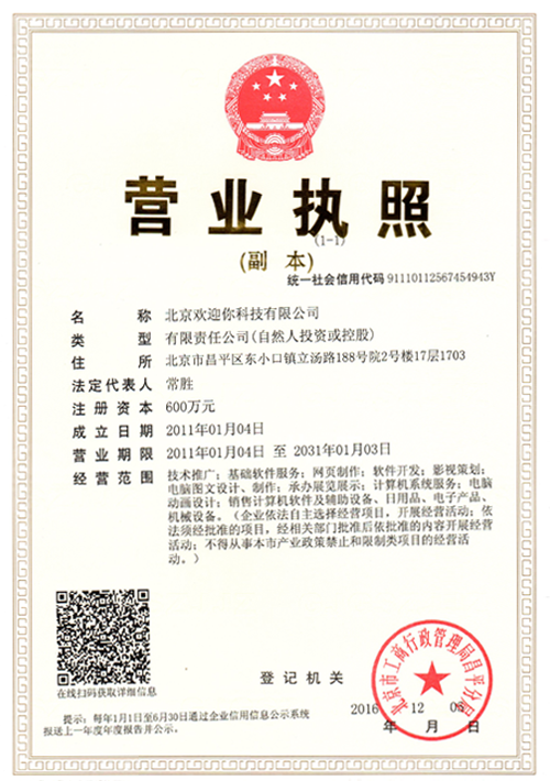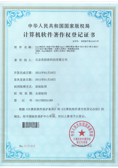 北京歡迎你科技有限公司獲得多項(xiàng)版權(quán)局"計(jì)算機(jī)軟件著作權(quán)登記證書(shū)",并已獲得“全國(guó)誠(chéng)信經(jīng)營(yíng)示范單位”、“全國(guó)質(zhì)量服務(wù)客戶滿意誠(chéng)信企業(yè)”和“全國(guó)重合同守信用品牌企業(yè)”等榮譽(yù)稱(chēng)號(hào)。